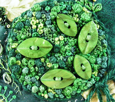 I like French knots and used them for some Assisi style embroidery in my crazy quilts. In these examples the empty spaces are covered with buttons.